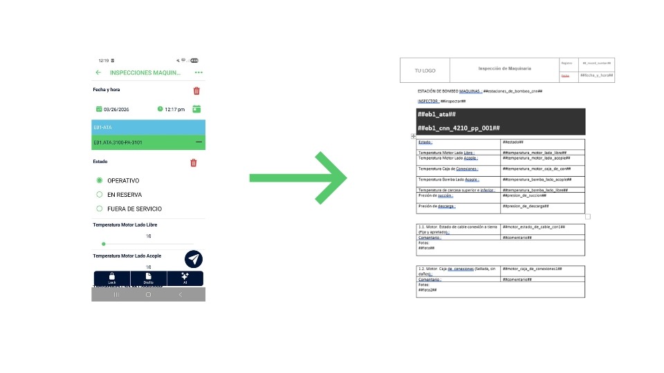 - El técnico completa el formulario en terreno. Al enviarlo, el sistema combina los datos capturados con la plantilla y genera el documento final listo para enviar.